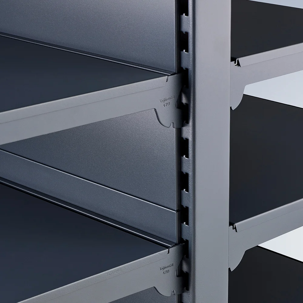 Thanks to the standardized Tegometall perforation system, the shelves can be easily repositioned in height and the unit can be expanded or reconfigured as needed. The powder-coated steel construction ensures durability, high load capacity, and long-term performance in demanding retail settings.
